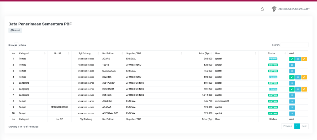 - Cocok digunakan untuk sistem kontrol berlapis dalam operasional apotek/klinik/rumah sakit yang memiliki pembagian tugas antara admin penerimaan dan apoteker penanggung jawab.