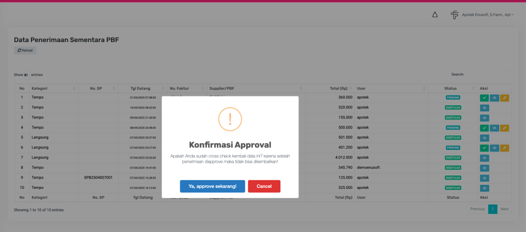 Fitur ini berfungsi untuk mengonfirmasi dan menyetujui data penerimaan barang dari PBF (Pedagang Besar Farmasi) sebelum data tersebut secara resmi masuk ke stok dan memengaruhi HPP maupun harga jual. Fitur ini hanya aktif jika diaktifkan melalui menu Setting Aplikasi dengan opsi Aktifkan Approval DO.