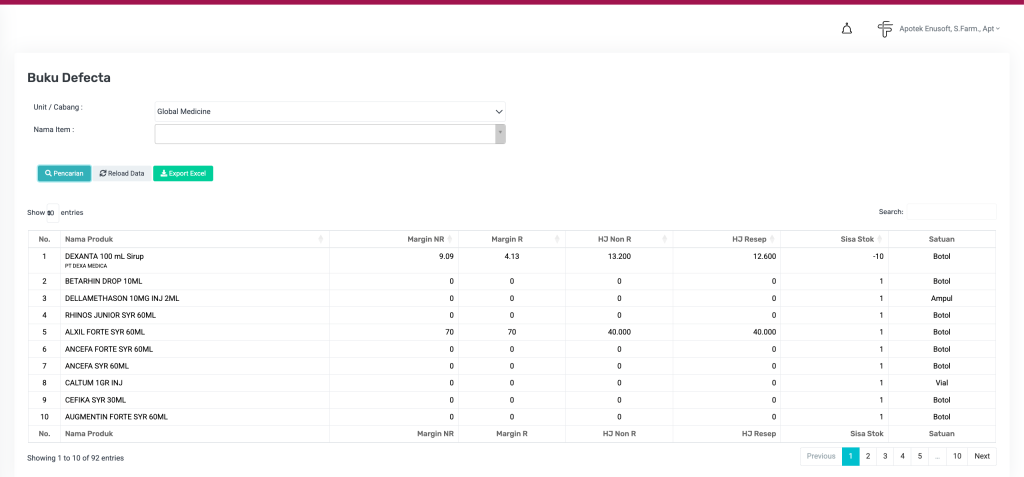 Sisa StokSisa stok aktual di sistem. Jika minus, artinya terjadi pengeluaran melebihi stok yang tercatat.