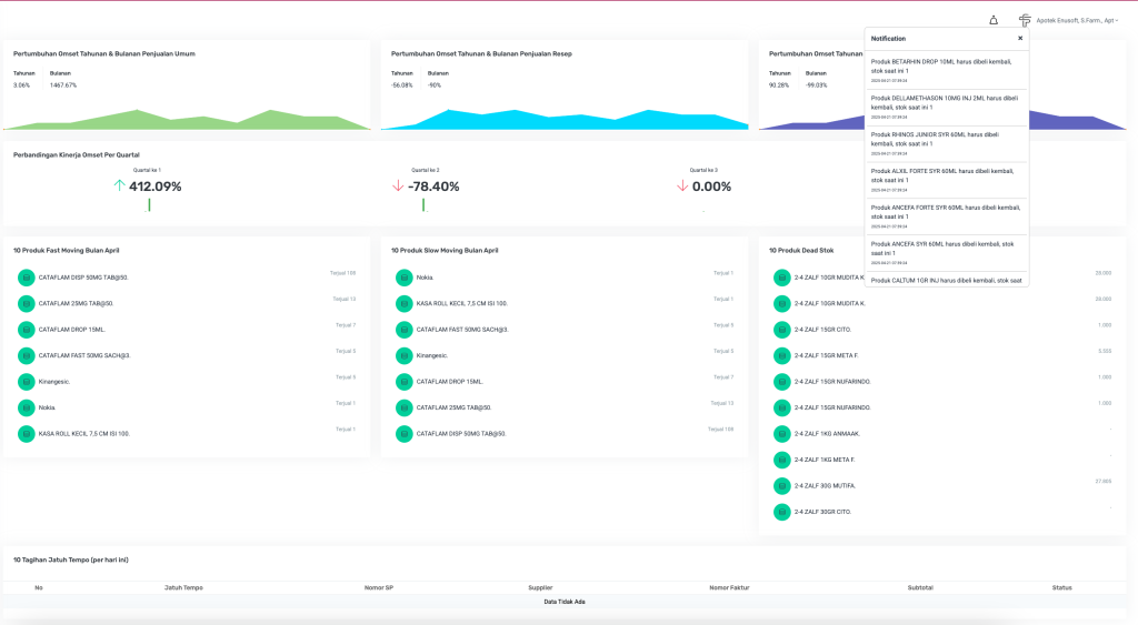 Halaman ini dirancang untuk memberikan gambaran umum kondisi terkini dari performa penjualan apotek, termasuk pertumbuhan omzet, produk terlaris, peringatan stok menipis, dan informasi tagihan jatuh tempo.