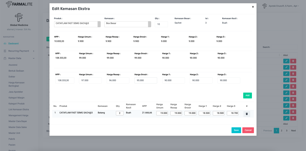 | Harga 1, 2, 3 | Alternatif harga lain yang bisa dipakai sesuai pengaturan pasien atau outlet. |
