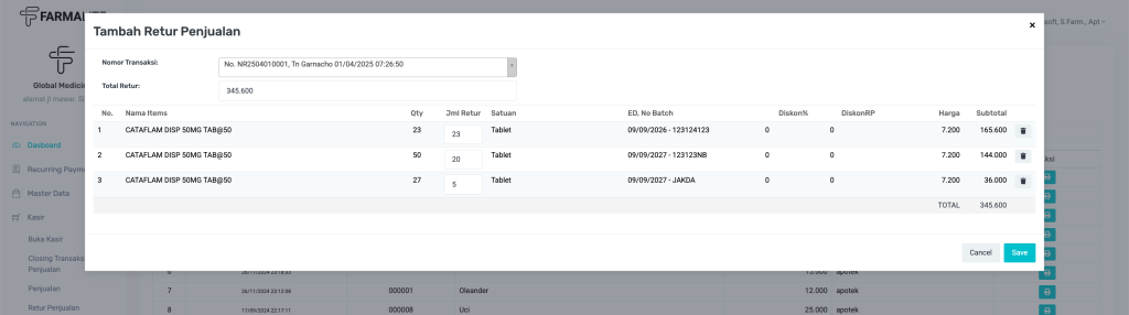 | Cancel | Membatalkan proses retur dan menutup form. |