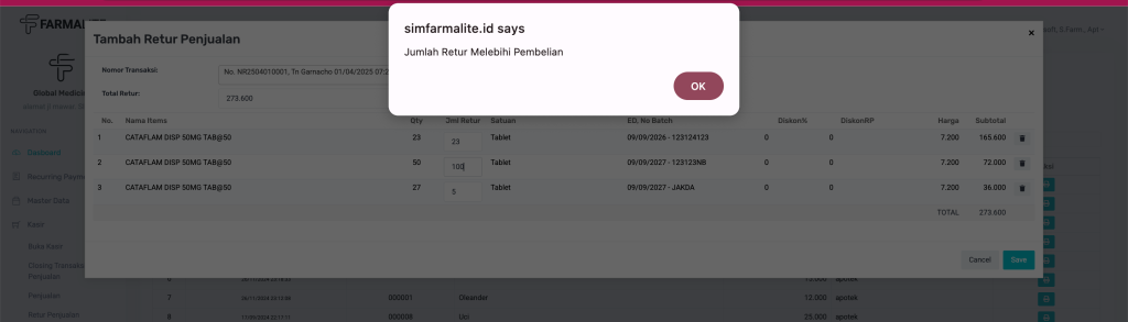 - Jika pengguna memasukkan nilai pada kolom Jml Retur melebihi Qty (jumlah beli), maka sistem otomatis akan menampilkan pop-up peringatan: “Jumlah Retur Melebihi Pembelian” dan tidak mengizinkan data disimpan sebelum diperbaiki.
