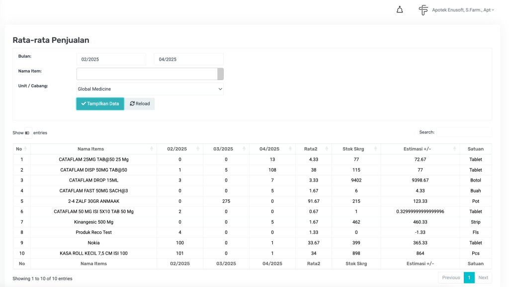 Fitur ini berfungsi untuk memprediksi kebutuhan stok di masa mendatang berdasarkan rata-rata penjualan pada periode waktu sebelumnya. Ini membantu apotek merencanakan pembelian secara lebih tepat dan efisien.