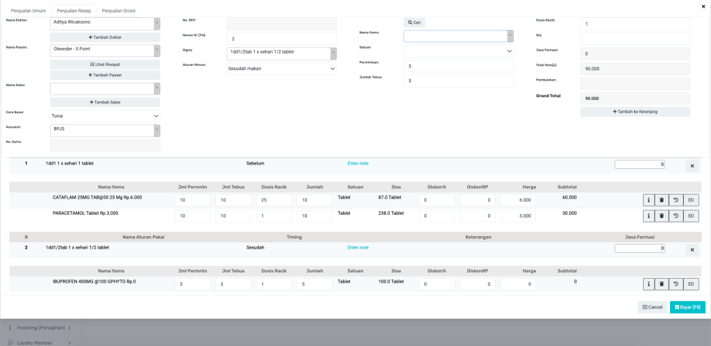 | Nama Items | Nama item obat yang diresepkan. Bisa dicari manual atau dipilih dari daftar. |