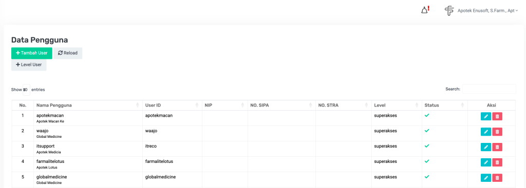 | Nama Pengguna | Nama alias pengguna yang digunakan di sistem. Biasanya berupa nama apotek/klinik atau nama pegawai. | Diisi saat pembuatan user baru. | apotekmacan |