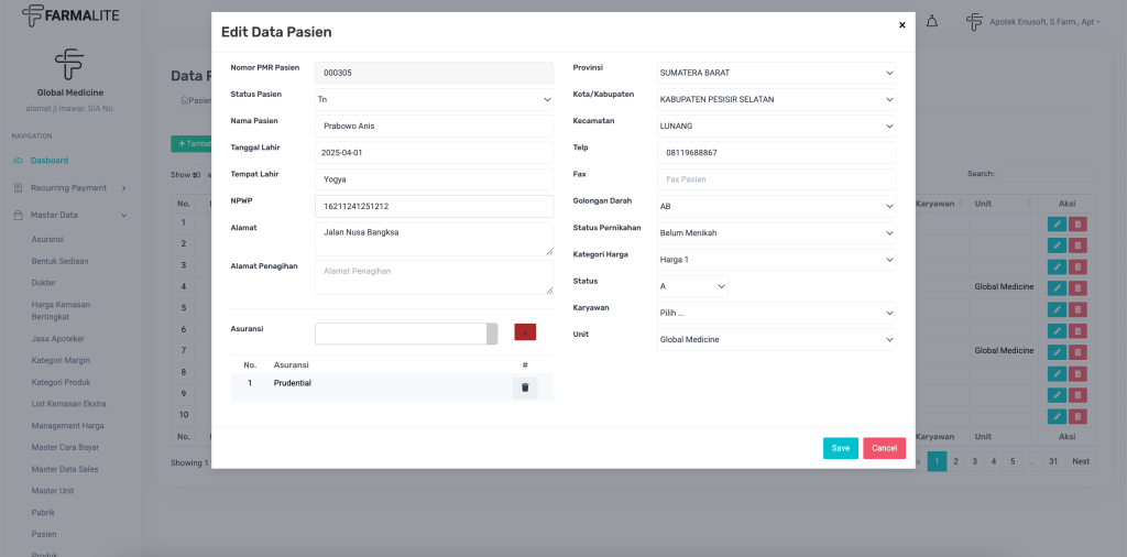 Form ini digunakan untuk menambah, mencatat dan memperbarui informasi pasien secara lengkap, mulai dari identitas pribadi, alamat, kontak, hingga pengaturan asuransi dan kategori harga yang digunakan saat transaksi.