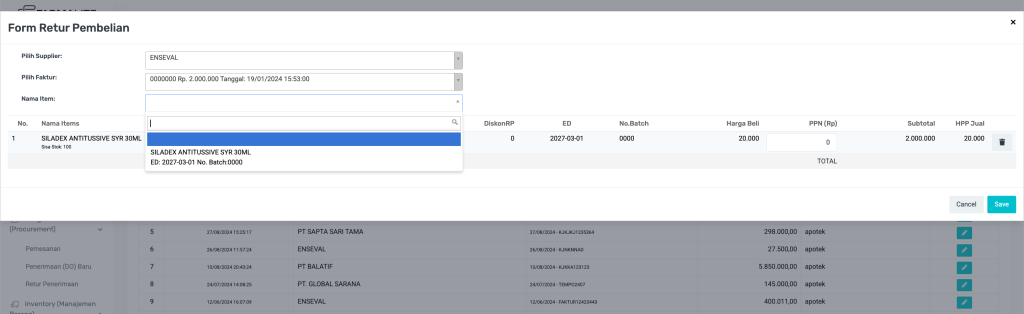 | Nama Item | Setelah memilih faktur, kolom ini menampilkan daftar item yang dapat diretur dari transaksi tersebut, lengkap dengan informasi ED dan No. Batch. |