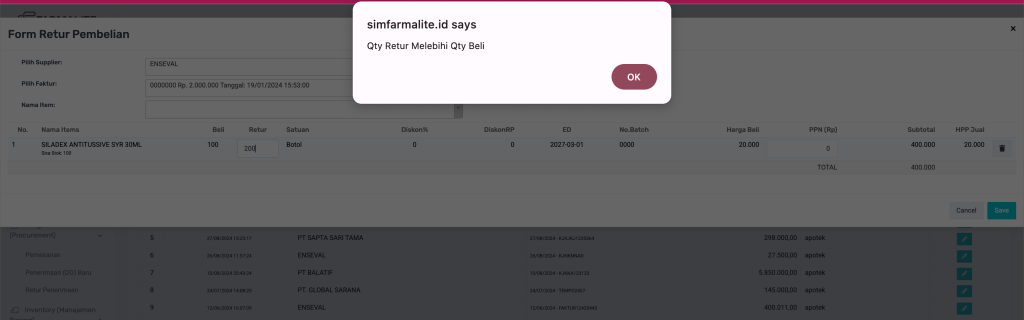 Jika pengguna memasukkan jumlah retur yang lebih besar dari jumlah beli, sistem akan memunculkan peringatan โQty Retur Melebihi Qty Beliโ.