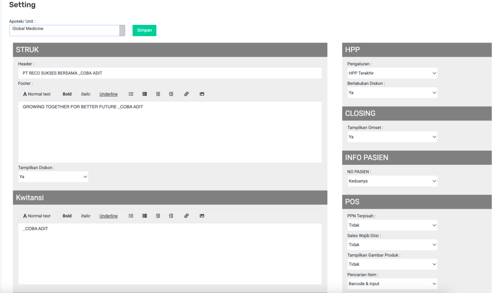 | Apotek/Unit | Menentukan nama unit/apotek pengguna sistem. | Ketik nama apotek/unit. | Global Medicine |