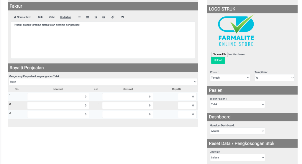 | Logo Struk | Menampilkan logo di struk pembelian. | Upload file logo (format JPG/PNG) dan atur posisi (Tengah/Kiri/Kanan). | Farmalite Online Store |