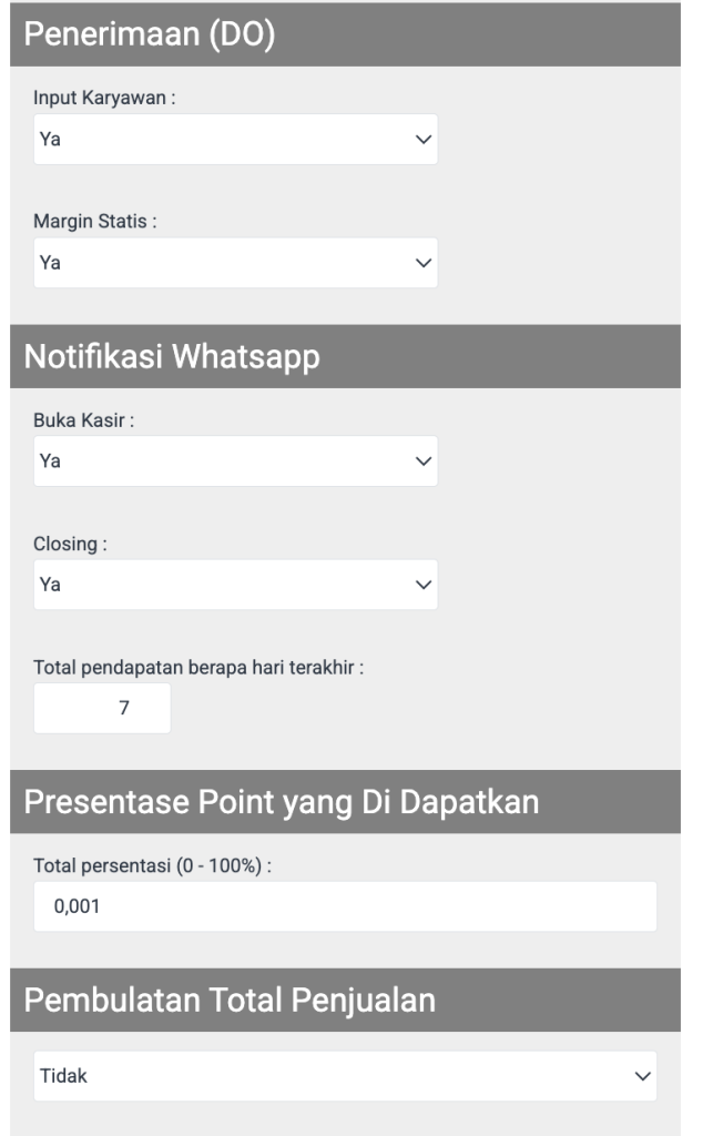 | Notifikasi Whatsapp – Closing | Mengatur apakah sistem mengirimkan notifikasi WA saat kasir closing. | Pilih Ya untuk mengaktifkan, Tidak untuk menonaktifkan. | Ya |