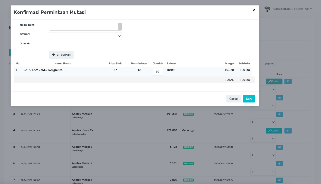 | Unit Apotek | Nama apotek cabang yang mengirim permintaan mutasi. |