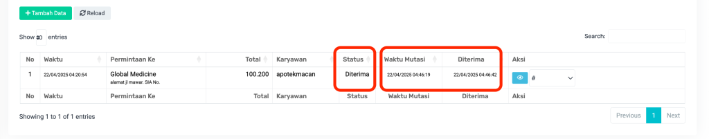 | Waktu Mutasi | Waktu saat proses mutasi disetujui oleh apotek pengirim. |