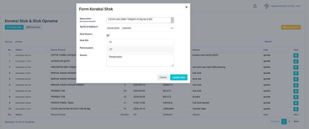Form ini digunakan untuk melakukan penyesuaian data stok di sistem dengan jumlah stok fisik sebenarnya. Koreksi dapat berupa penambahan atau pengurangan stok dan dilakukan berdasarkan ED dan No Batch produk. Fitur ini sangat penting untuk memastikan data persediaan selalu akurat, terutama setelah stok opname atau ada kesalahan input.