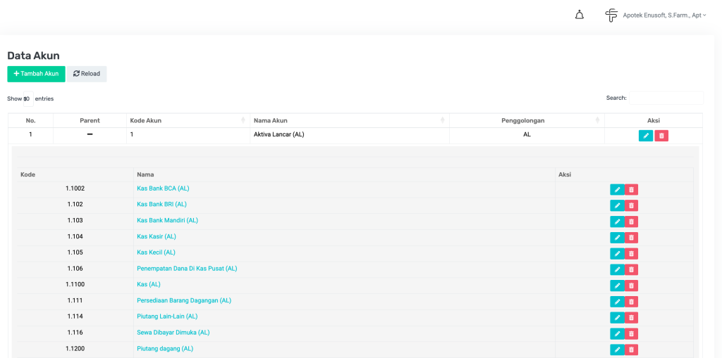 Fitur Data Akun digunakan untuk mengelola struktur akun-akun yang menjadi dasar pencatatan dalam sistem akuntansi apotek. Setiap transaksi yang tercatat (baik dari jurnal umum, penjualan, pembelian, dll) akan mengacu pada akun yang telah dibuat di sini.