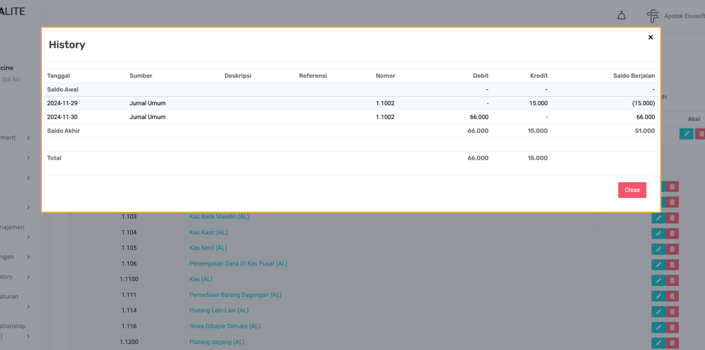 Jika nama akun diklik, akan muncul pop-up berisi histori transaksi akun tersebut.