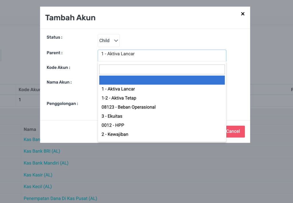 | Parent | Jika status = Child, maka pilih akun induknya |