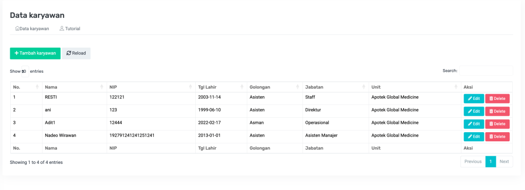 - Pagination: Navigasi antar halaman data jika data karyawan sangat banyak.