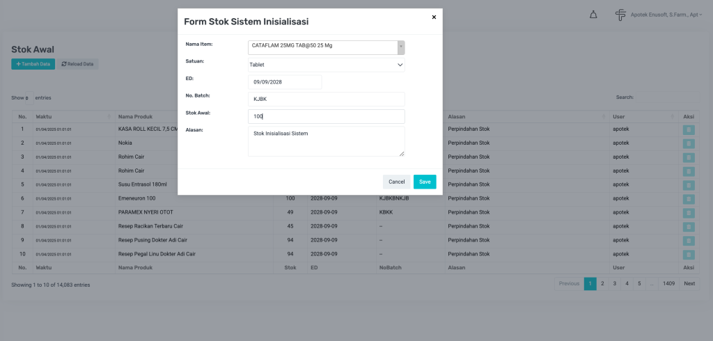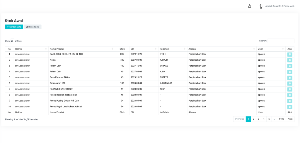 - Setelah sistem berjalan normal dengan transaksi pembelian, pemakaian, retur, dll — sebaiknya tidak lagi menggunakan stok awal untuk menambah stok.