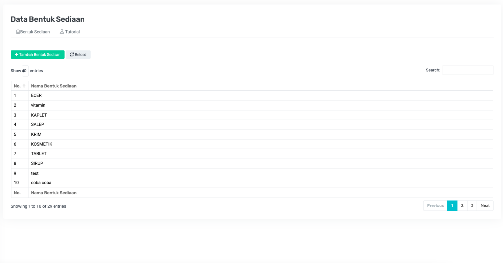 1No.Nomor urut dari entri bentuk sediaan. Otomatis dihasilkan oleh sistem.Tidak perlu diisi (otomatis).
