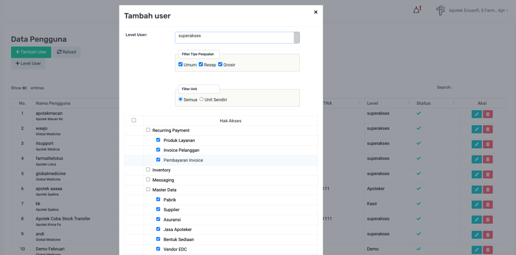 - Level Superakses sebaiknya dibatasi hanya untuk manajer/apoteker penanggung jawab utama.