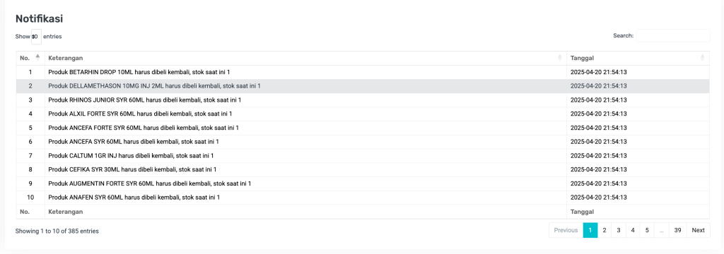 | Stok Rendah | Pemberitahuan bahwa stok produk hampir habis dan perlu dibeli kembali. | Produk BETARHIN DROP 10ML harus dibeli kembali, stok saat ini 1 |