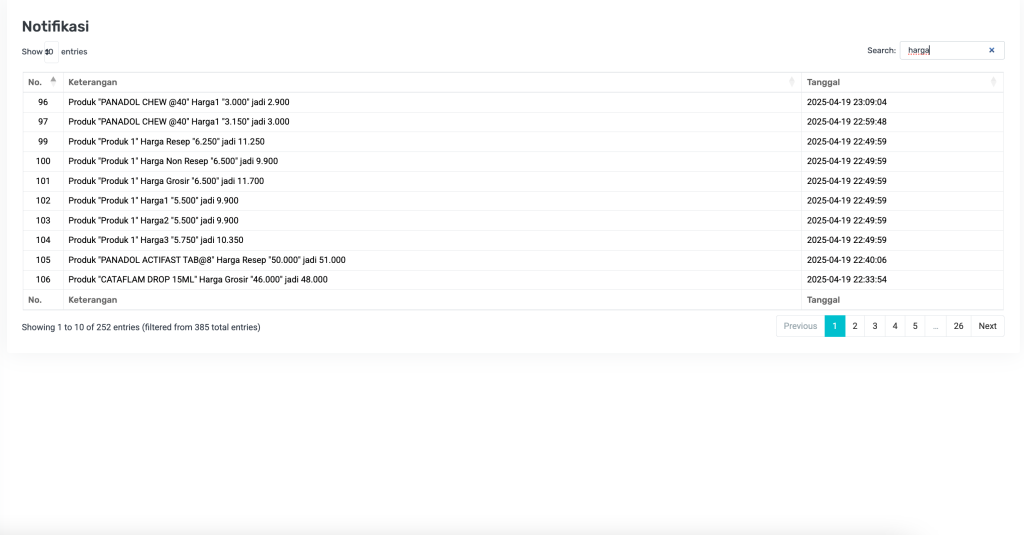 hargauntuk mencari perubahan harga). - Gunakan navigasi halaman (Next, Previous) untuk menelusuri seluruh notifikasi.